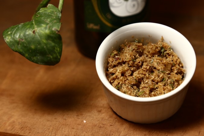 A linhaça não altera o gosto do patê mas dá um upgrade no valor nutricional, trazendo ômega 3 e 6, fibras, proteínas e antioxidantes. Por isso, não é necessária, mas convém incorporá-la. Assim como a Alga Nori, que também tem suas propriedades e pode trazer um gosto mais acentuado de Mar. Se quiser usar nessa receita, passe a alga seca no liquidificador (também bem seco) até virar quase um pó, e use-o no patê, colocando mais, ou menos, de acordo com a sua preferência – geralmente faço sem porque acho que já fica muito parecido com o patê original – e não, não fica com gosto de coco! =]