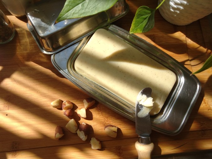 Essa receita de manteiga é bem parecida com esta aqui, porém é mais simples de fazer  porque nem sempre  temos o leite vegetal a mão e com esta receita não será preciso fazê-lo na hora. Além disso,  é possível armazenar as castanhas na despensa para tê-las sempre por perto na hora de incrementar os pratos. Primeiro ferva as castanhas em água filtrada por 10 minutos. Nessa receita, usei castanha do Pará, por isso vemos esses pontinhos na manteiga, mas você pode tirar a casca toda ou usar outra castanha, caso não queira os pontinhos. Depois, basta seguir o método que é o mesmo que a outra receita: Juntar todos os ingredientes em um recipiente e bater por 1 minuto usando o mixer. Pode bater no liquidificador também, porém, caso você tenha um mixer, sugiro usar ao invés do liquidificador, porque faz menos sujeira ;) Para dar esse formato da foto, eu coloquei a manteiga líquida, assim que acabei de bater, na tampa da manteigueira e levei ao freezer por 3 horas. Depois desenformei como fazemos com o gelo, torcendo a tampa levemente para os lados, até que a manteiga desgrudasse da tampa. Depois é só manter na geladeira. Compartilhe com quem você ama e com quem não sabe o que passar no pão pela manhã! Para outras dicas de do que passar no pão, veja requeijão de amendoim, requeijão de tofu, ricota de castanha, ricota de tofu, inhamepiry e manteiga; e para dicas de café da manhã, clique aqui! Divirta-se e bom apetite! Para receber mais receitas, entre no grupo de Telegram, clicando aqui!