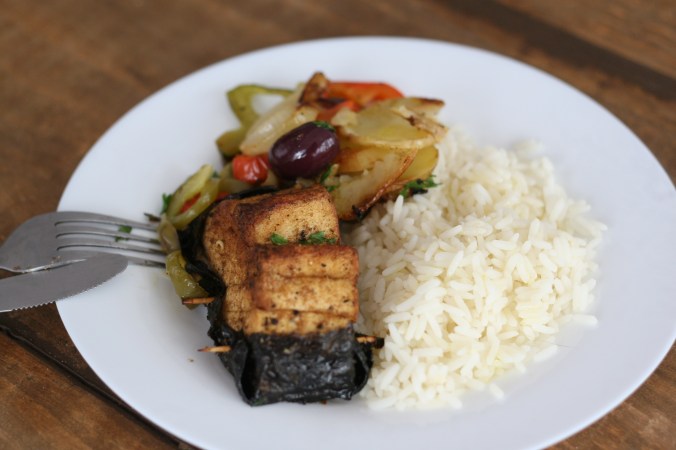 Depois de embrulhar o tofu, coloque-o na assadeira onde temperou o azeite. Repita o processo com todos os pedaços. Leve a travessa para a geladeira por cerca de, no mínimo, uma hora para que o tofu pegue bem o sabor dos temperos secos, para a alga pegar o gostinho do azeite, e pro óleo de coco endurecer.