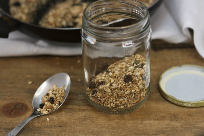 Você pode trocar as passas por damasco seco picado, lascas de coco queimado, coco ralado seco, nibs de cacau, gotas de chocolate amargo, etc. Também pode usar castanhas do Pará, avelã, noz pecan, amendoim, enfim. Dá para juntar todos ou ir descobrindo combinações diferentes também. É fácil, divertido e nutritivo.