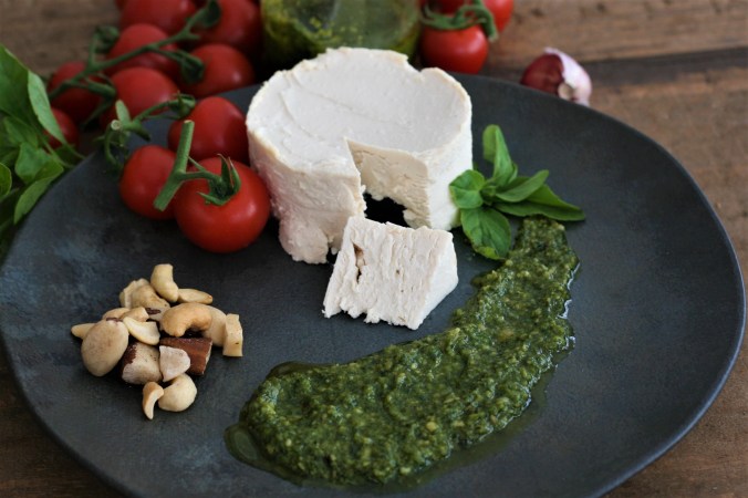 Você ainda pode cobrir essa belezura com ervas frescas picadas, com zaatar, com pimenta calabresa e orégano, enfim, fica delicioso e é perfeito para compor uma tábua de frios vegana ou com esse pesto maravilhoso!