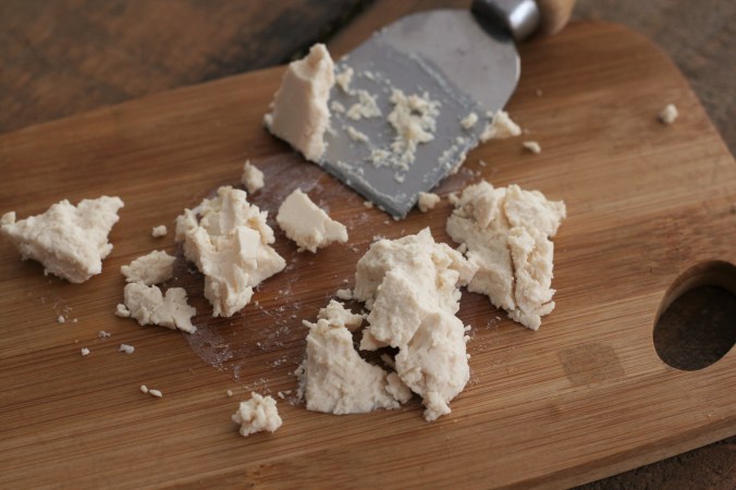 Esse queijo vegano fica com uma textura parecida com o gorgonzola, ele fica firme e você pode cortar, mas se você espalhar com a faca, ele desliza pelo pão também. Fica perfeito para comer despedaçado na salada, numa sopa quentinha, no pão e na pizza!