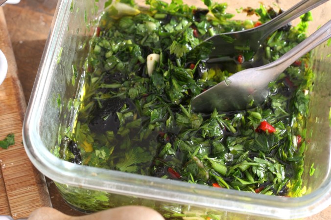Lave e seque o maço de salsinha e cebolinha. Pique o maço com a faca e junte ao azeite temperado. Escorra as algas marinadas se houver caldo e esprema-a com a mão. Ainda com as mãos, separe os pedaços de alga uns dos outros e leve à tigela com o azeite temperado. Misture muito bem.